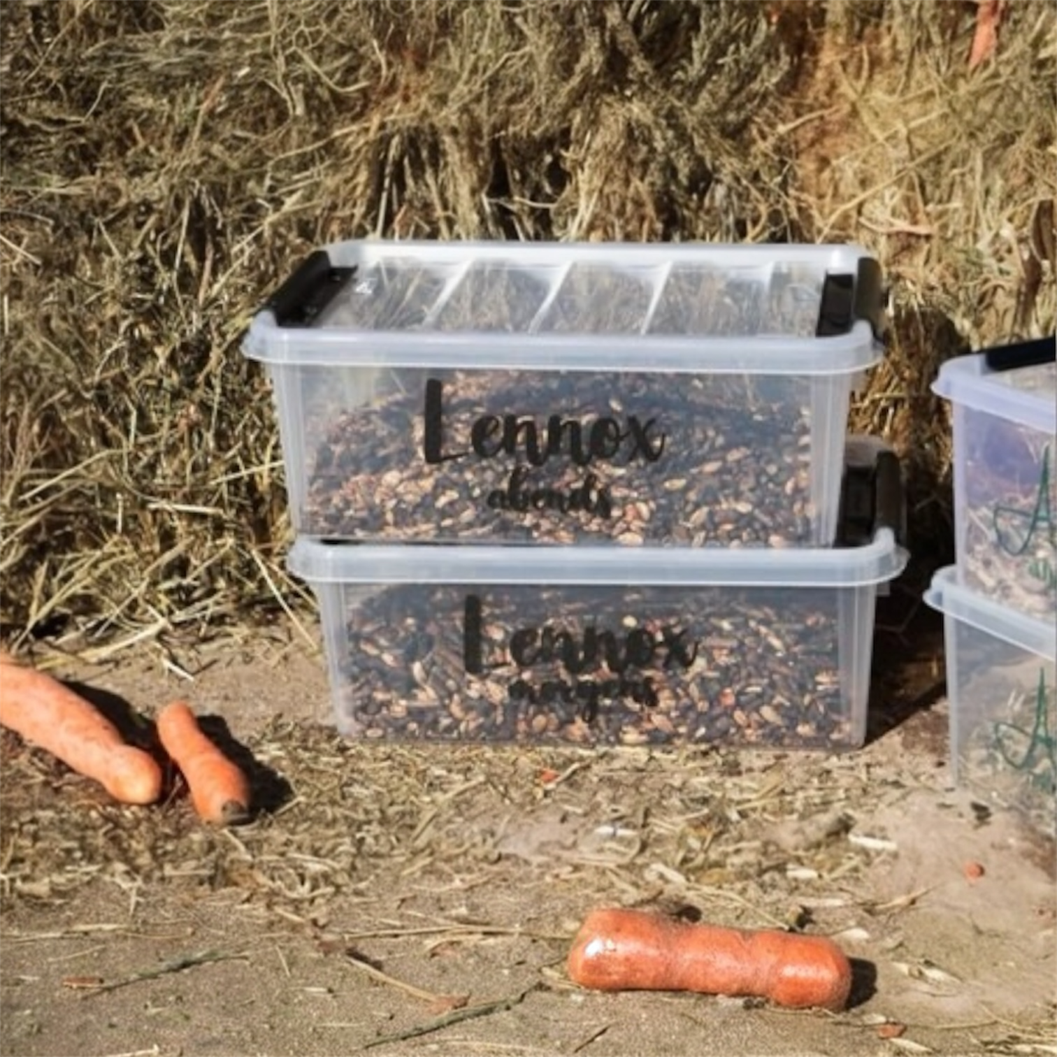 Praktische Boxen zur Futteraufbewahrung bzw. -vorbereitung mit Deckel und Clipverschlüssen.