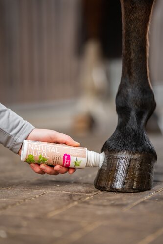 Nach der Hufreinigung auf die äußere Hufwand und den Kronrandbereich auftragen. Vor Gebrauch gut schütteln!